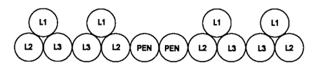 1. Níže je znázorněn návrh rozložení jednožilových kabelů. Chci se zeptat, zda je takovéto uložení akceptovatelné z hlediska rozložení proudů v jednotlivých kabelech jedné fáze? Jde o to, že si nejsem zcela jist, jak do rozdělení proudů může vstoupit fakt, že by byly taženy pouze dva kabely jako vodiče PEN. Případně musí se táhnou vodiče PEN ve shodném počtu jako je počet paralelních vodičů v jedné fázi?